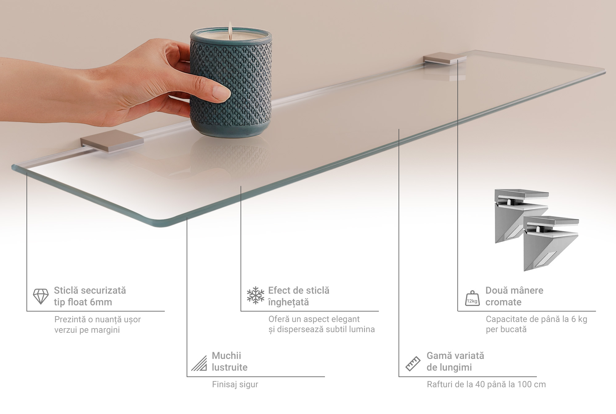 Raft din sticlă semîtransparent este o poliță dreptunghiulară din sticlă securizată, cu finisaj mat care atenuează transparența și oferă o textura vizuală plăcută. Tafla are margini șlefuite și o grosime compactă de 6 mm, iar suprafața semiopacă adaugă profunzime și liniște vizuală, creând un efect subtil de difuzie a luminii fără reflexii puternice. Designul transmite un sentiment curat și ordonat, potrivit pentru spații care cer claritate și eleganță discretă.